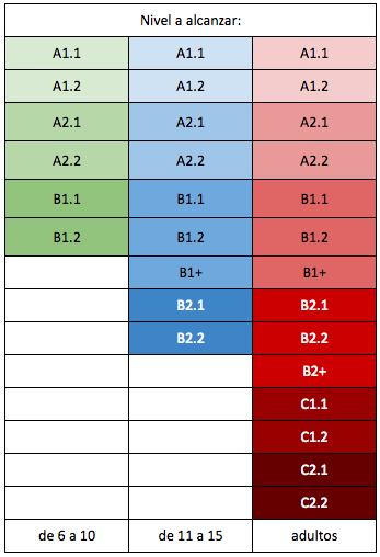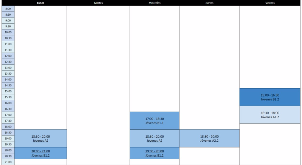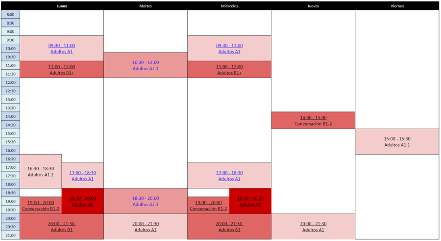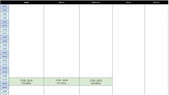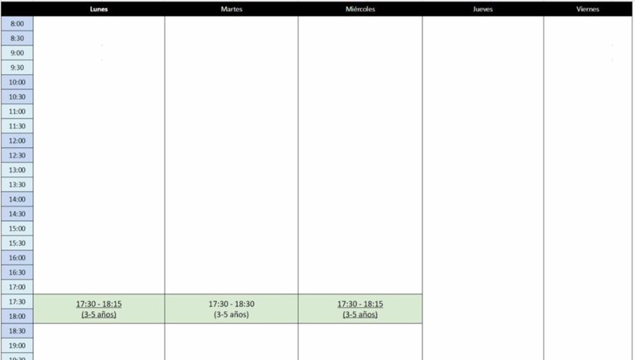 Horario de cursos ofertados según nivel (de claro a oscuro) y rango de edad (verde, azul y rojo):