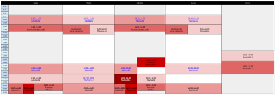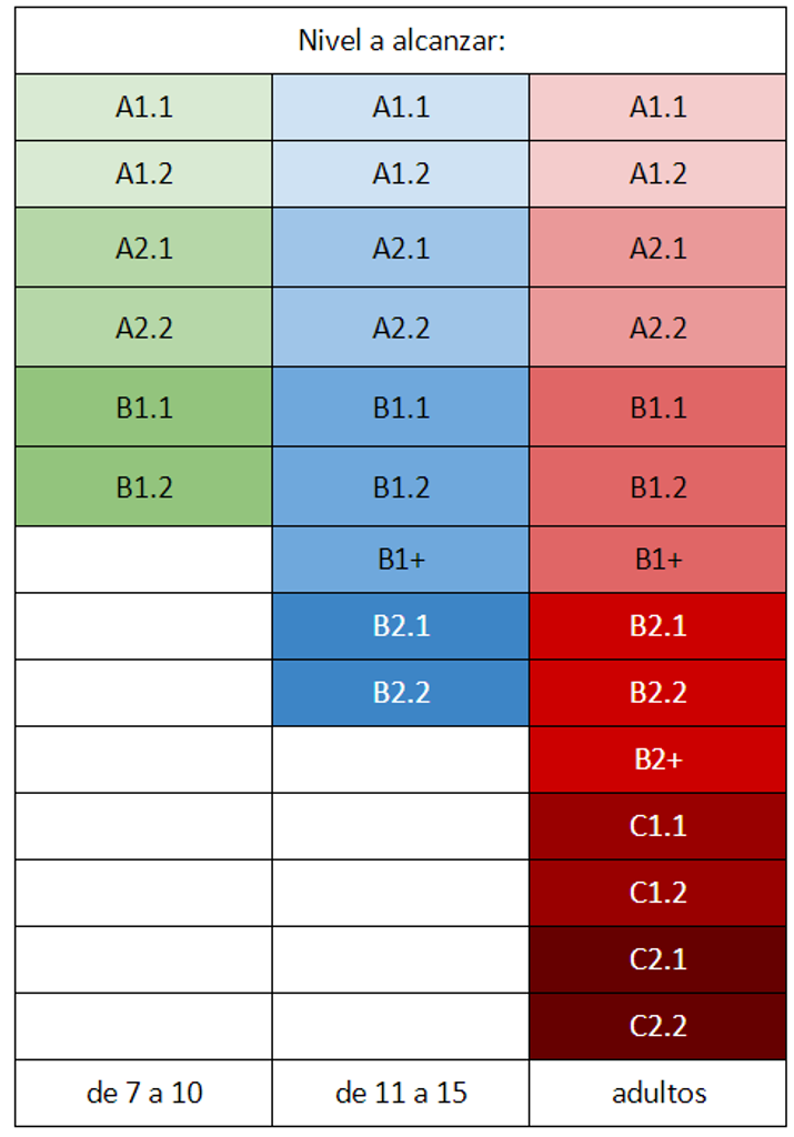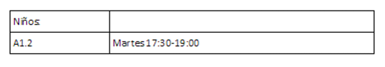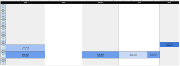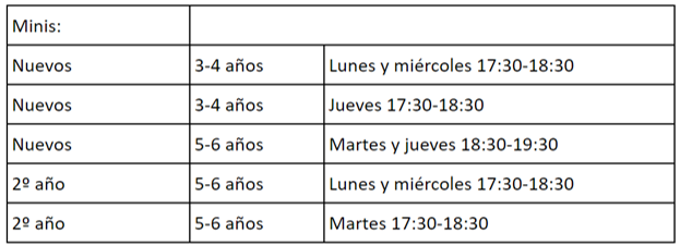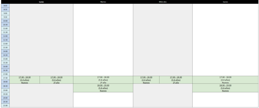 Horario de cursos ofertados según nivel (de claro a oscuro) y rango de edad (verde, azul y rojo):