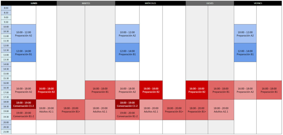 - Jóvenes A2: Lunes - Miércoles - Viernes de 10-12h